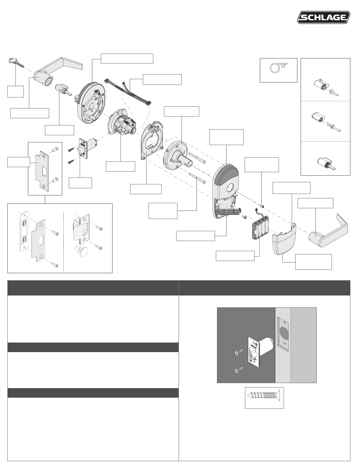 Page 2 p516 958 nde wireless lock p516 958 model nde80 installation instructions and user guide cylinder options full size ic fsic outside assembly pin wrench ribbon cable small format sfic spring cage outside lever cylinder standard cylinder inside assembly escutcheon strike.