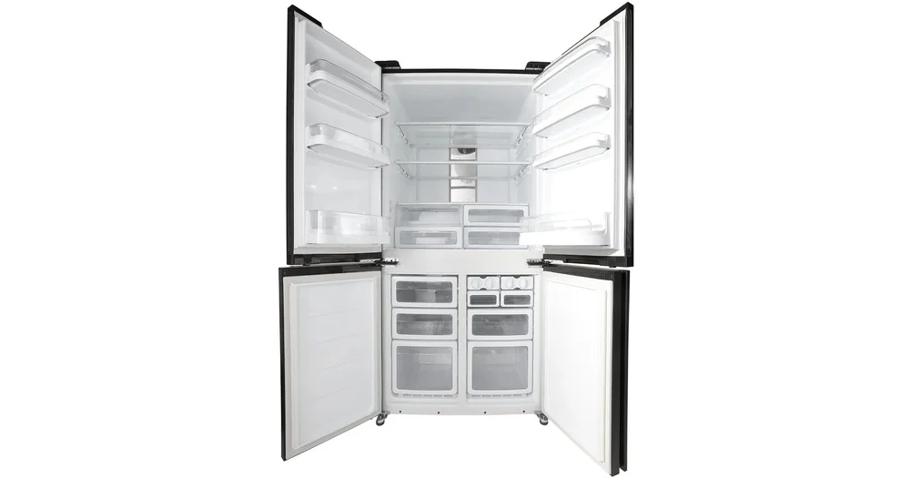 The sharp stylish 676 litre four door french door refrigerator employs a premium elegant flat black glass door finish to complement any kitchen.